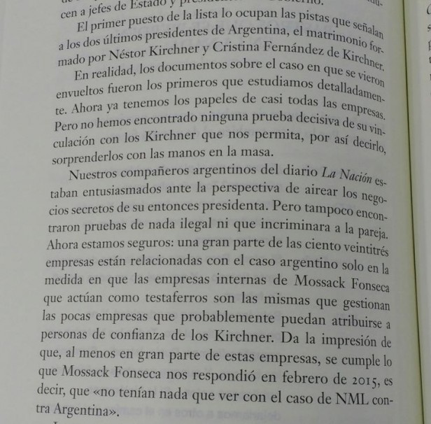 Según el relato de los protagonistas,“nuestros compañeros argentinos del diario La Nación estaban entusiasmados ante la perspectiva de airear los negocios secretos de su entonces presidenta. Pero tampoco encontraron pruebas de nada ilegal ni que incriminara a la pareja”.