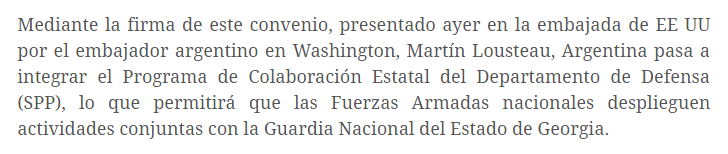 Por su parte la Embajada norteamericana destacó en un comunicado que “inspirado en las metas de política exterior del Departamento de Estado de los Estados Unidos, el SPP es administrado por la Oficina de la Guardia Nacional y apoya los objetivos de cooperación en materia de seguridad de los comandantes de teatros de operaciones”. Cabe recordar que este convenio fue solicitado a principios de 2016 por el presidente Mauricio Macri.