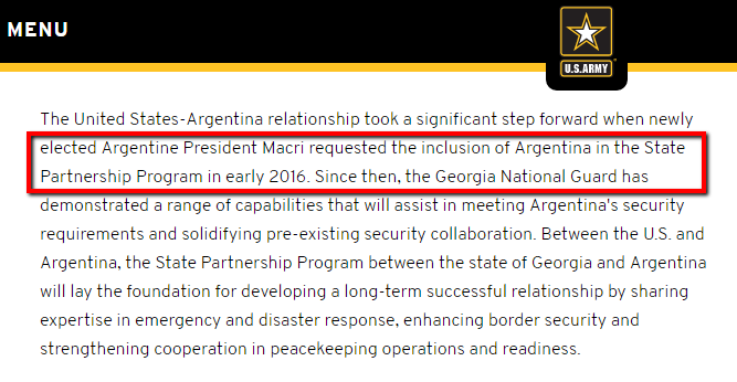 El 10 de noviembre de 2016 el gobierno del estado norteamericano de Georgia anunció que la Guardia Nacional de ese estado había sido seleccionada como la operadora del Comando Sur Militar Estadounidense para la República de Argentina como parte del Programa de Asociación Estatal (SPP) del Departamento de Defensa.
