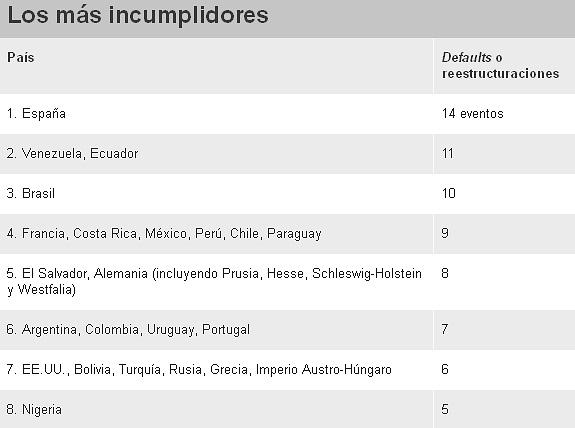 El peor deudor de la historia ha sido España, con 14 crisis relacionadas con compromisos financieros, mientras que Argentina figura bastante más abajo, con 7 eventos. Incluso varios países latinoamericanos están más altos en la lista: Venezuela y Ecuador (con 11); Brasil (con 10), y Costa Rica, México, Perú y Chile (con 9).