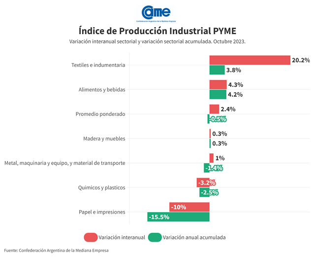 En octubre, el sector de "Textil e Indumentaria" experimentó un crecimiento anual del 20,2% en la producción a precios constantes, siendo ésta la mejor performance del mes. Por otro lado, el sector de "Papel e Impresiones" tuvo la mayor caída interanual: el 10%.