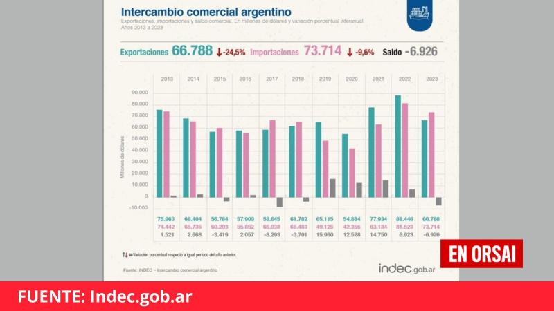 El intercambio comercial del país presenta cifras preocupantes al acumular un déficit de U$S 6926 millones en 2023. Las exportaciones se desploman un 24,5%, afectadas por la sequía y la caída en la producción agrícola, mientras las importaciones muestran una disminución del 9,6%.