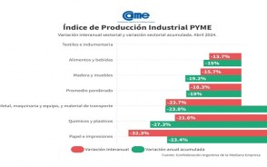 Por su parte, se detalló que los seis sectores manufactureros del segmento pyme tuvieron caídas en la comparación anual en abril, siendo los más afectados Papel e Impresiones (-32,3%) y Metal, maquinaria, equipos y material de transporte (-23,7%).