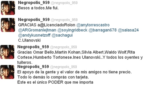 “La Negra” oficializó a través de su cuenta de Twitter su retiro de FM Rock & Pop, señal en la que llevaba adelante "Negrópolis", junto a Humberto Tortonese, Natalia Carulias, Carlos Sturze e Ingrid.