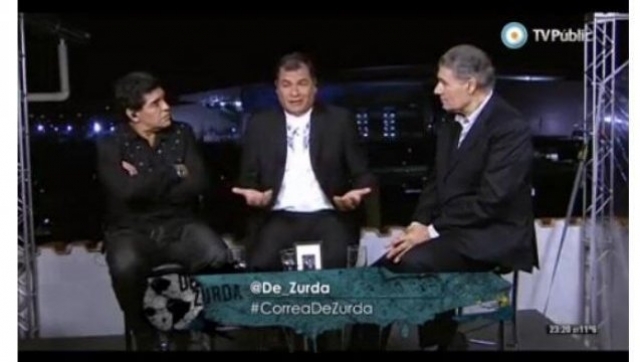 Anoche, en el programa que transmiten Telesur y la TV Pública, el astro del fútbol y el prestigioso periodista recibieron al presidente de Ecuador, quien afirmó: "Vinimos a dar un apoyo a Dilma".