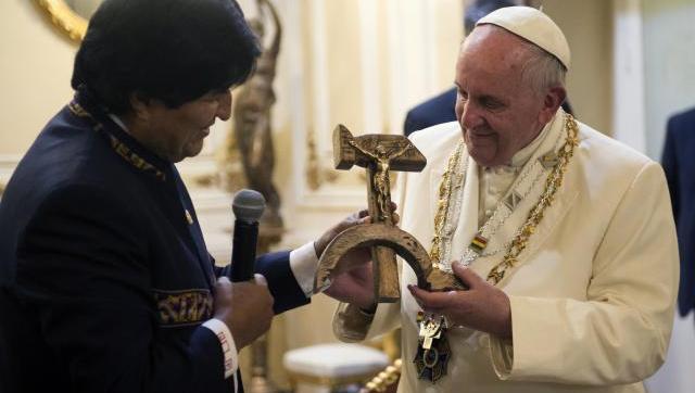 La prensa derechista, cuándo no, puso el acento un regalo que la víspera le había dado Evo al Papa: un crucifijo tallado en madera con la hoz y el martillo en forma de cruz y el Cristo crucificado.