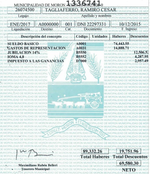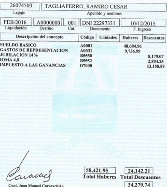 En febrero de 2016, el sueldo neto (de bolsillo) del intendente Tagliaferro era de $ 34.279,74.