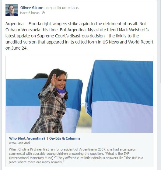 El reconocido cineasta estadounidense expresó su apoyo a nuestro país en la disputa contra los fondos buitre y culpó al "ala derecha de La Florida" de realizar ataques especulativos.