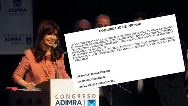 La presidenta Cristina Fernández de Kirchner cursa el primer día de internación por un cuadro febril infeccioso con bacteriemia, informó la Unidad Médica presidencial en un parte médico y agregó que "se realizaron estudios complementarios que confirmaron el diagnóstico presuntivo de sigmoiditis".