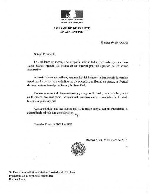 "Expreso mi agradecimiento por el mensaje de simpatía, solidaridad y fraternidad que me hizo llegar cuando Francia fue tocada en su corazón", manifestó el presidente galo en su mensaje a la jefa de Estado argentina.