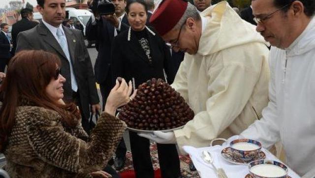 “Llegamos a Marruecos a las 10.30 hora local. Como siempre, la hospitalidad y la cordialidad, el signo distintivo. Al pie del avión 2 altísimos marroquíes con sus trajes típicos, con dátiles, leche de vaca Samir con gotas de azahar”, detalló la mandataria y acompaño el texto con una foto.