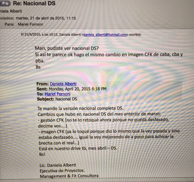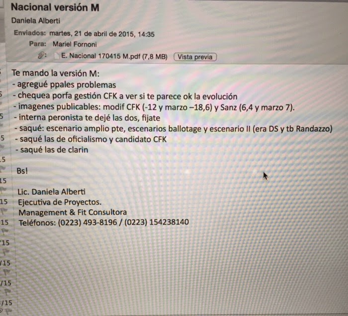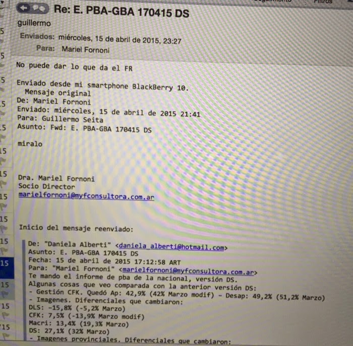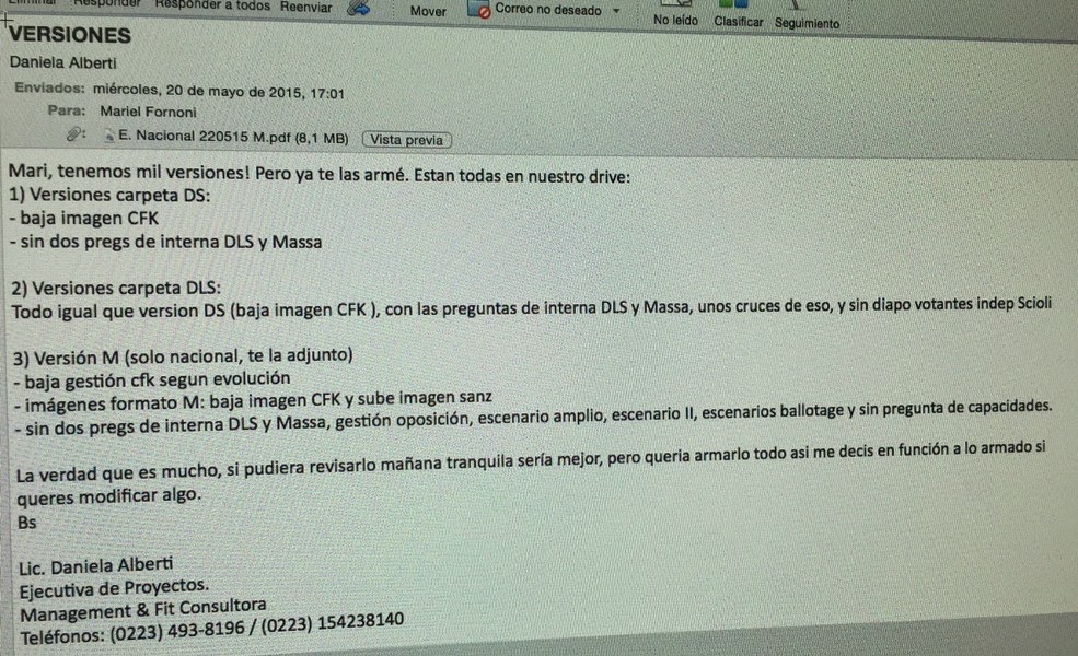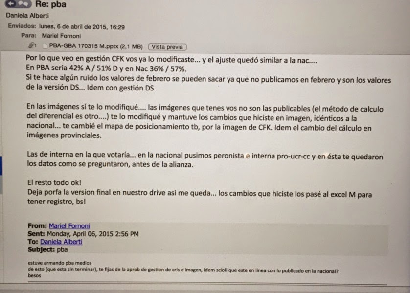 En los correos, se habla de “bajar la imagen de CFK, que creció 5 puntos”, sostener la de Mauricio Macri, “que bajó 10 puntos”, y “Me parece que Stolbizer está muy alta, Massa queda cuarto en el escenario. Corto!”.
