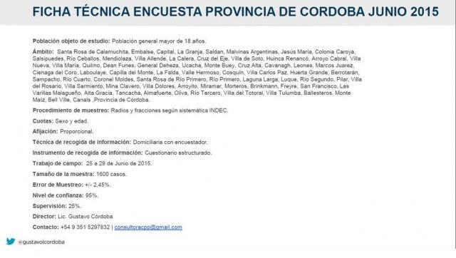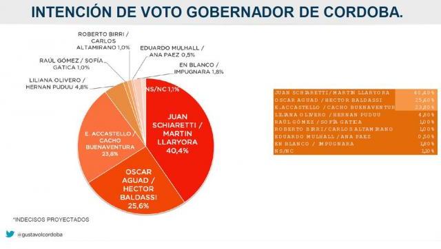 El consultor Gustavo Córdoba, que muchos sindican como cercano al oficialismo, dio a conocer su última encuesta para las elecciones cordobesas de este domingo, en medio de una campaña desinflada, a la que sólo el candidato kirchnerista Eduardo Accastello agitó por su necesidad de descontar puntos, especialmente a la macrista alianza Juntos por Córdoba.