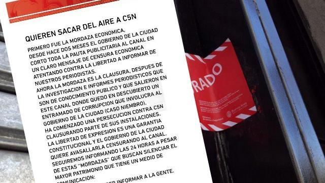 "Luego de la investigación e informes periodísticos en los que quedó al descubierto el entramado de corrupción que involucra al gobierno porteño y Fernando Niembro, la Ciudad inició una avanzada contra la libertad de expresión y clausuró parte de las instalaciones de C5N", sostiene el texto.