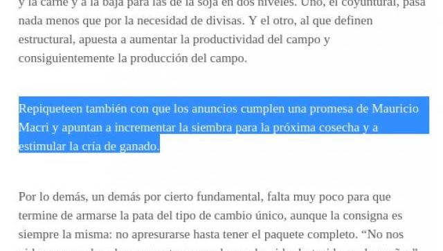 Pero en esta oportunidad, fueron aún más explícitos y cometieron un error garrafal: escribieron dentro de la nota las indicaciones para que Macri quede mejor parado ante la liberación del dólar: "Repiqueteen con que los anuncios cumplen una promesa de Mauricio Macri y apuntan a incrementar la siembra para la próxima cosecha y a estimular la cría de ganado", dice en un párrafo que recién fue modificado a primera hora de hoy.