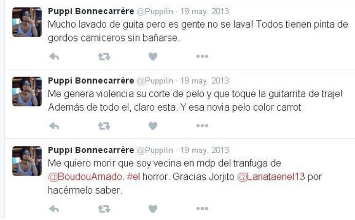 Según reprodujo Perfil, Puppi publicó un twitt en el que carga contra los kirchneristas y en espacial contra Amado Boudou: “mucho lavado de guita pero esta gente no se lava! Todos tienen pinta de gordos carniceros sin bañarse”.