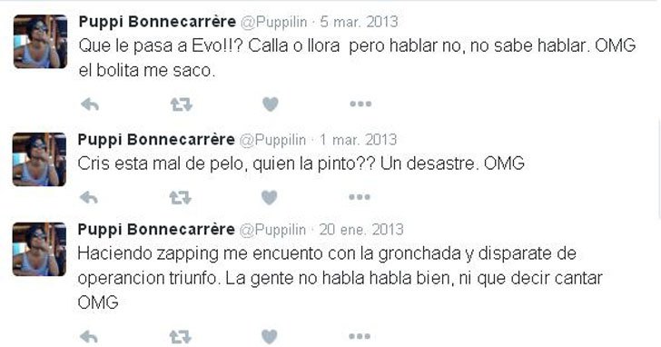 “que le pasa a Evo (Morales, presidente de Bolivia), calla o llora, pero hablar no, no sabe hablar, OMG el bolita me sacó”, reza otra de sus intervenciones en la red social.