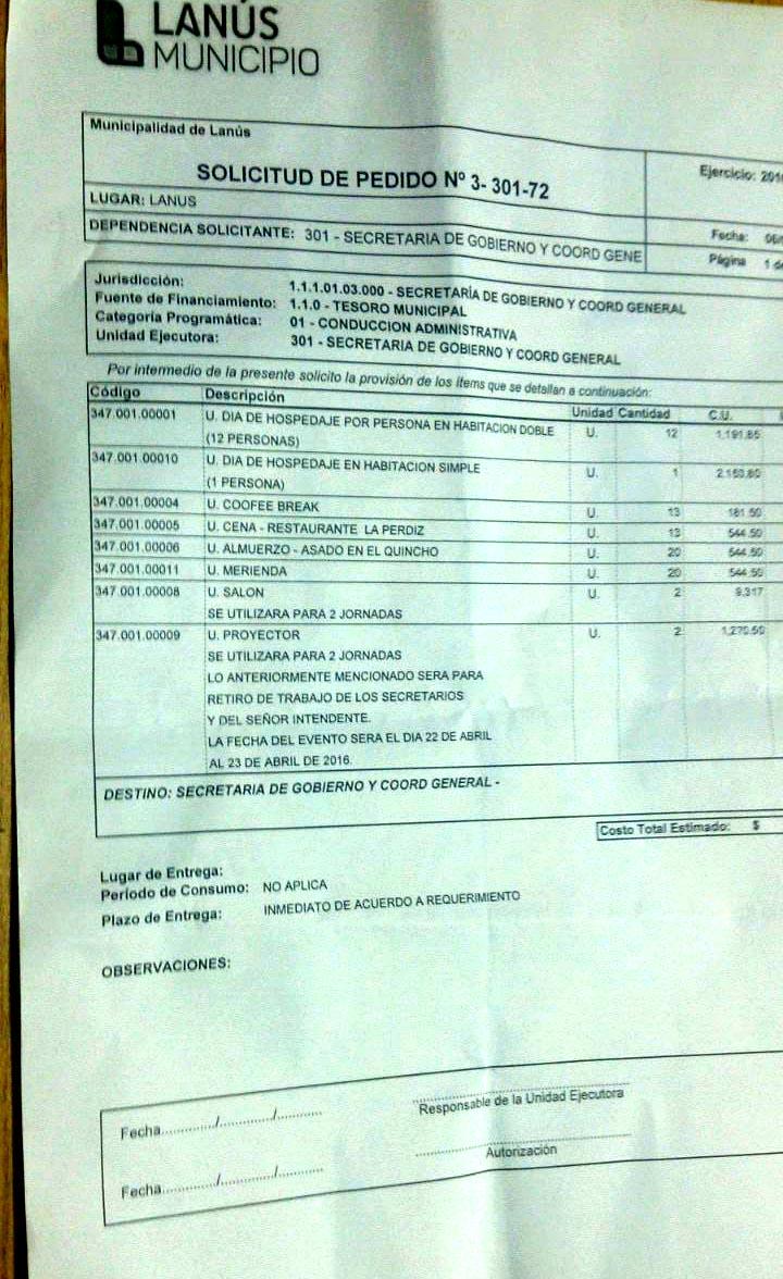 El portal “La Defensa, diario digital”, de Lanús, publicó La solicitud de pedido Nº3-301-72 (Foto), correspondiente a la Secretaría de Gobierno a cargo de Adrián Urreli, que certifica el pago por parte del municipio con los impuestos recaudados de los vecinos, para que el jefe comunal y doce secretarios participen del denominado “Tean Building”; una serie de charlas motivacionales para “energizarse políticamente” y jugar al focus group, para ensayar como gobernar, en momentos donde se dispara la inflación, la pobreza y la desocupación.