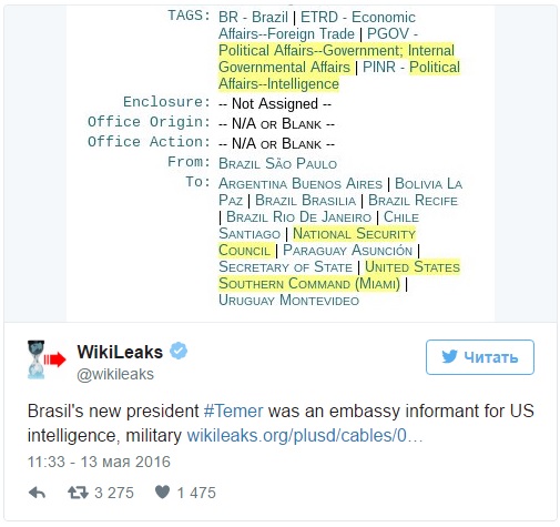 El nuevo presidente interino de Brasil, Michel Temer, fue informante de la embajada de EE.UU. en Brasil, ha revelado WikiLeaks a través de su cuenta en Twitter.