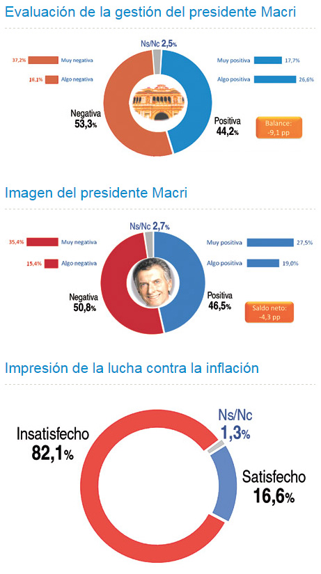 Según indicó el diario Página 12, el estudio sostiene que “con la economía instalada en el centro de la escena desde hace más de cuatro meses y con un país fuertemente preocupado por la inflación y la desocupación, es lógico que la imagen positiva del presidente siga en descenso”.