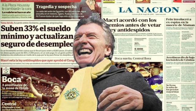 Los medios que ofician de propaladores de relato oficial intentan proteger a Mau de los costos que le propiciará el veto a la Ley Antidespidos, sancionada por el Congreso ayer a la madrugada. Clarín y La Nación se desesperan por mostrar a un presidente con una sensibilidad social, totalmente nula.