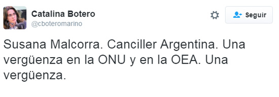 La ex Relatora de Libertad de Expresión y abogada constitucionalista, Catalina Botero, eligió las redes sociales para expresar su rechazo contra la funcionaria argentina. “Susana Malcorra. Canciller Argentina. Una vergüenza en la ONU y en la OEA. Una vergüenza”, sostuvo.