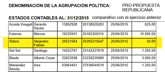 Sidero aportó la módica suma de 50 pesos a la campaña del Pro en diciembre del año pasado