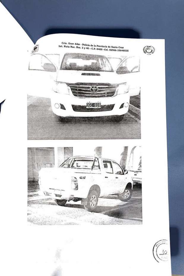 A los dos documentos, uno de la División Canes de esa localidad y otro de la comisaría, se suma al informe las imágenes de la camioneta demorada donde viajaban los seis oficiales. Una Toyota Hilux blanca.