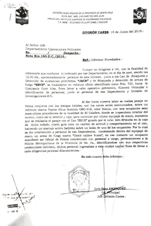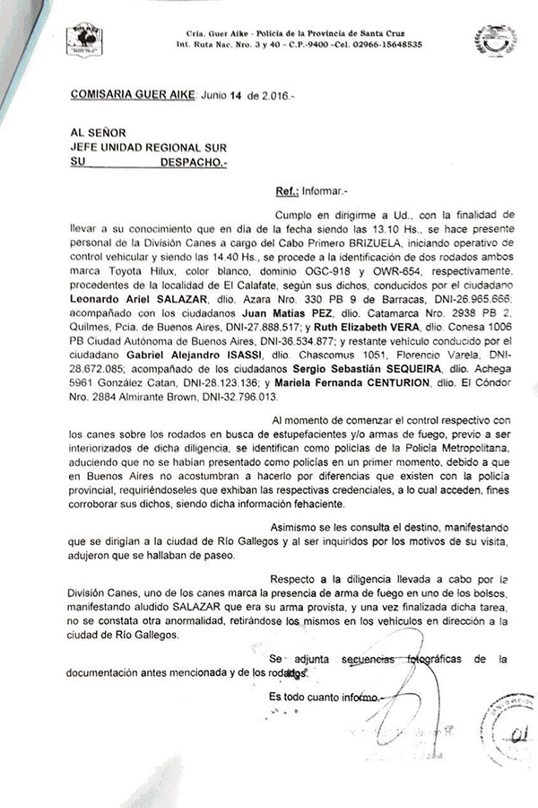 "Procedentes de la localidad de El Calafate" y "se dirigían a la ciudad de Río Gallegos", son dos de las frases que contiene el documento de la comisaría Guer Aike de Santa Cruz que dan cuenta del accionar sospechoso de seis agentes de la Policía Metropolitana en esa provincia.