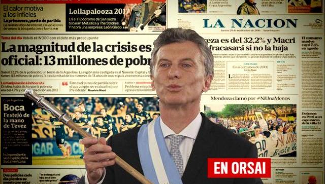La Nación afirma que “la pobreza es del 32,2% y Macri dijo que fracasará si no la baja” como titulo principal de hoy. Según uno de los columnistas favoritos del poder conservador, Carlos Pagni, el escenario es de “ecos cercanos de 2001”.