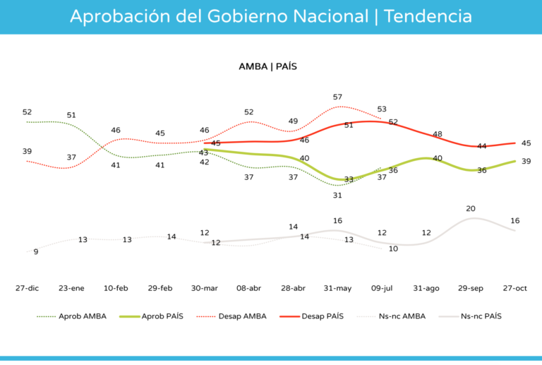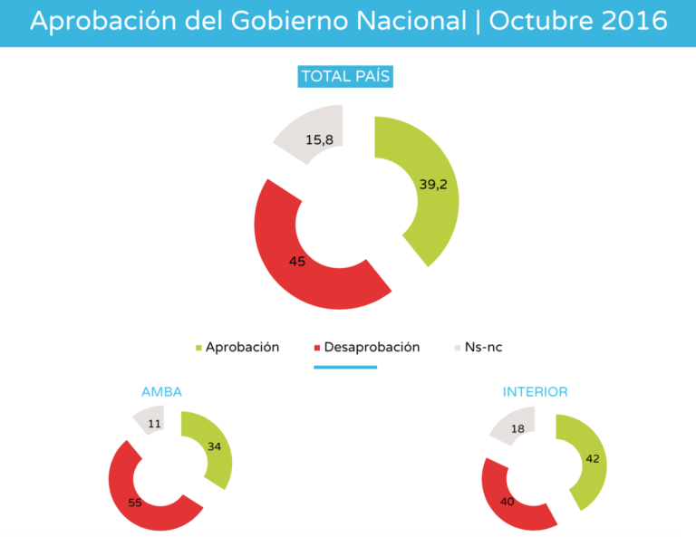 En la encuesta también se mide la aprobación del gobierno de Mauricio Macri. Un 39,2% aprueba la gestión y un 45 la desaprueba. Si analizamos la zona de AMBA el 34% la aprueba y el 55% desaprueba. En el Interior el 42% lo aprueba y el 40% lo niega.