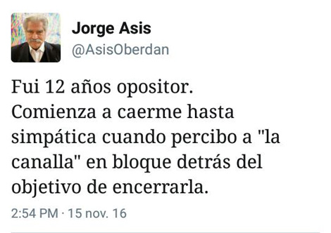 En uno de ellos confiesa que: “Fui 12 años opositor. Comienza a caerme hasta simpática cuando percibo a “la canalla” en bloque detrás del objetivo de encerrarla”.
