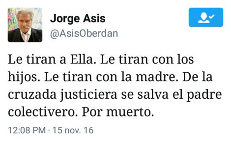 También hizo referencia a las acusaciones que pesan sobre Ofelia la madre de la ex presidenta, y manifestó en otro twitter: “Le tiran a Ella. Le tiran con los hijos. Le tiran con la madre. De la cruzada justiciera se salva el padre colectivero. Por muerto”.