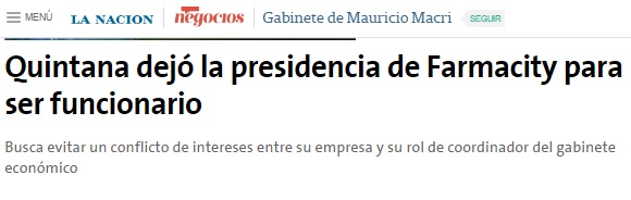Pero todos sabemos que para Cambiemos, es difícil ponerle tope a las millonarias ganancias de las farmacias con los medicamentos, ya que uno de los principales funcionarios del gobierno de Macri es Mario Quintana "Ex dueño" de Farmacity que algunos dudan del ex.