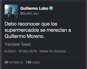 El periodista que reocnoció extrañar a Moreno fue nada menos que Guillermo Lobo. Por medio de su cuenta de twitter afirmó que algunos supermercados se merecen a Moreno.