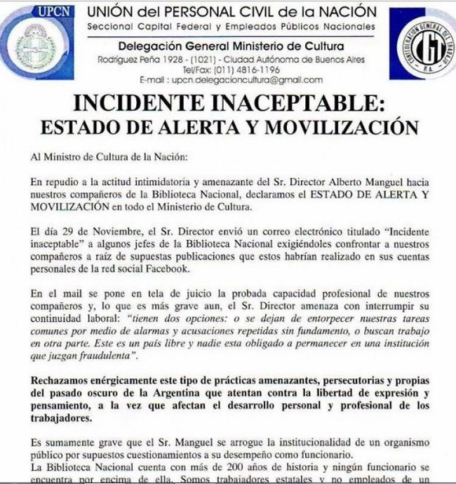 Empleados de la Biblioteca Nacional denunciaron que su director, Alberto Manguel, “persigue y amenaza con interrumpir la continuidad laboral” de los empleados por sus publicaciones en sus cuentas personales de la red social Facebook. Por eso, trabajadores de todo el Ministerio de Cultura se declararon en “estado de alerta y movilización”, según indicó la Unión del Personal Civil de la Nación a través de un comunicado dirigido al ministro de Cultura de la Nación.
