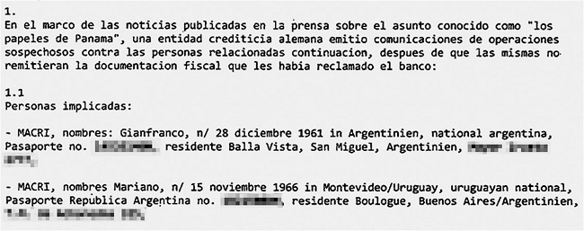 "En el marco de las noticias publicadas en la prensa sobre el asunto conocido como «los papeles de Panamá» -detalló Interpol- una entidad crediticia alemana emitió comunicaciones de operaciones sospechosos [sic] contra las personas relacionadas continuación [sic], después de que las mismas no remitieran la documentación fiscal que les había reclamado el banco".