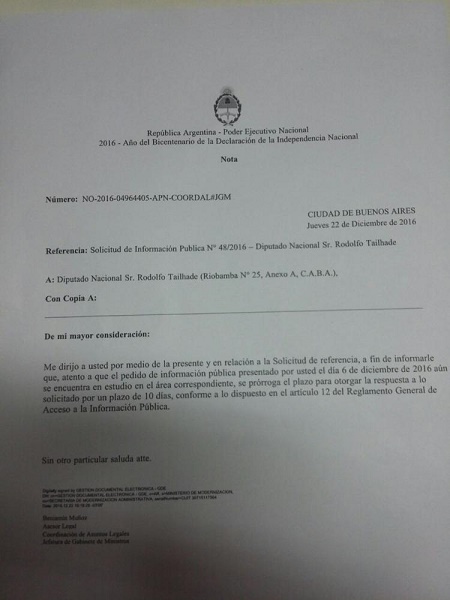 Quien se encargó de la cuestión fue la Jefatura de Gabinete a cargo de Marcos Peña, pero curiosamente la respuesta fue pedir una prórroga de 10 días más para informar qué función pública cumple, qué remuneración recibe, qué horarios de ingreso y egreso tiene, su categoría y modalidad de contratación, entre otros datos laborales muy comunes.