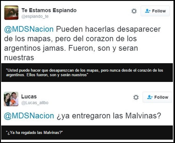 Tweet de espiando_te usuario lee: Usted puede hacer que desaparezcan de los mapas, pero nunca desde el corazón de los argentinos. Fueron, son y serán los nuestros