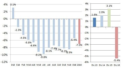 Las cantidades vendidas por los comercios minoristas cayeron 5,4% en diciembre 2016 frente a igual fecha de 2015. El consumo en el último mes del año fue mejor de lo esperado y se redujo la tasa de declive, pero igualmente continúa por debajo de los niveles del año pasado.