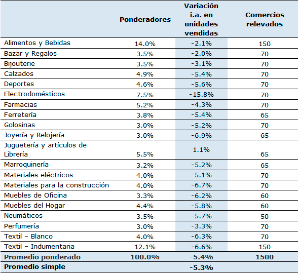 Para calcular la variación anual promedio de las ventas, se utilizó un promedio ponderado. La ponderación de cada rubro se estimó de acuerdo a datos del Censo Económico 2004/05 y datos que viene relevando CAME para conocer la distribución del consumo en esa fecha.