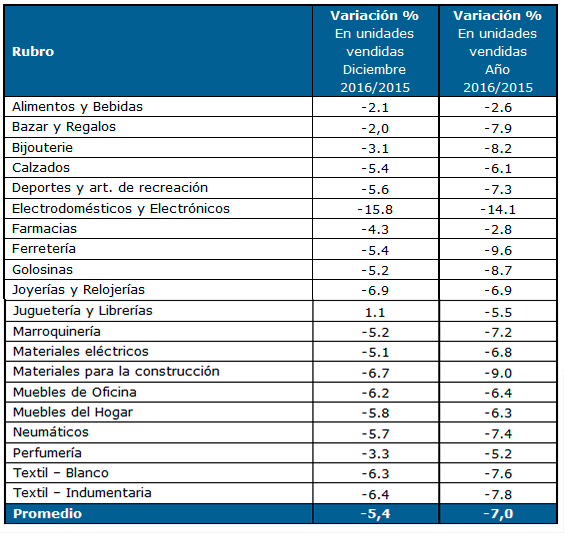 Las cantidades vendidas por los comercios minoristas cayeron 5,4% en diciembre frente a igual mes de 2015, en un año donde la pérdida de poder adquisitivo de las familias y las altas tasas de inflación redujeron la demanda interna. Con ese resultado el año finalizó con una caída promedio de 7% en las ventas.