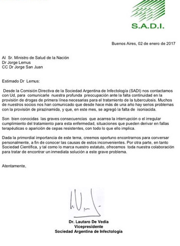 Pero pese a las fotos de ocasión con sonrisas, desde la Sociedad Argentina de Infectología (SADI) le escribieron una misiva a Lemus para conocer los motivos de la interrupción de los medicamentos para tratar la tuberculosis.