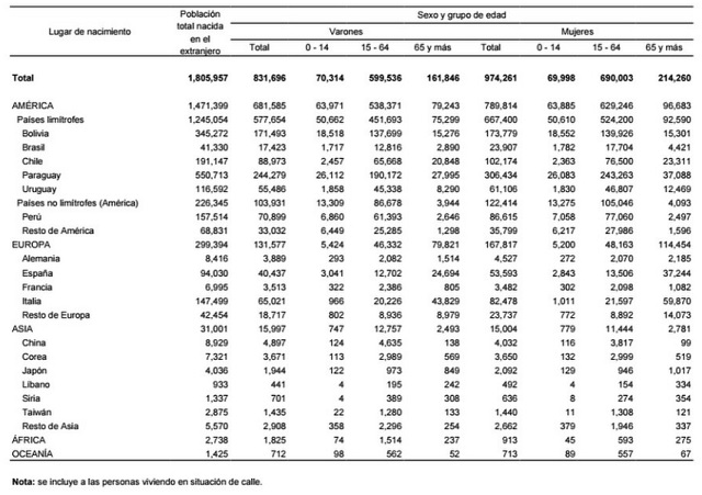 En 2010, de acuerdo con el último censo poblacional, vivían en el país 1,8 millones de extranjeros, de los que 1,5 venían en su mayoría de países limítrofes, como Bolivia, Paraguay y Chile; o no limítrofes, como Perú. Se trata de un 4,5% del total de habitantes de la Argentina.