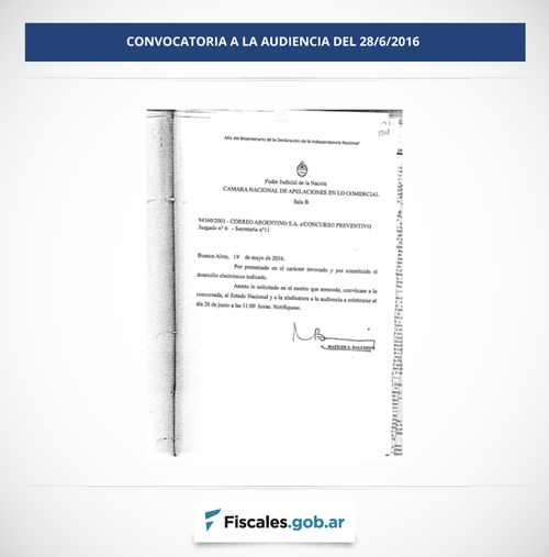 Ante las manifestaciones de miembros del gabinete Nacional en relación a que no habría participado - no obstante haber sido citada por la Sala B de la Cámara del fuero - de la audiencia de fecha 28/6/16 celebrada en el concurso de Correo Argentino S.A. en la cual se acordó la propuesta impugnada en mi dictamen del 30/12/2016 , comunico que jamás fui convocada a dicha audiencia y que los únicos citados a participar fueron la concursada, el Estado Nacional y las sindicaturas.