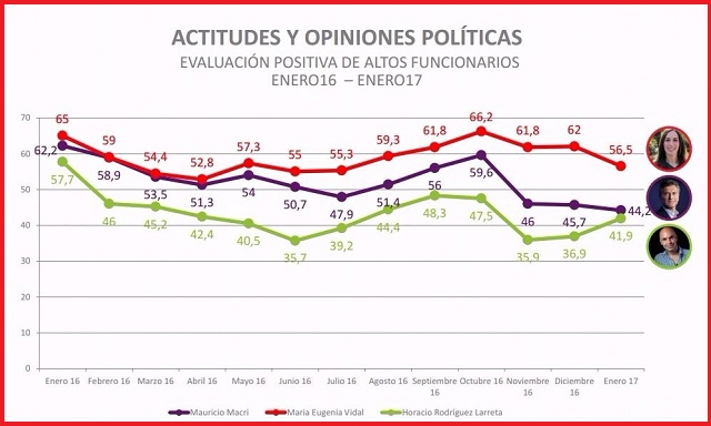 “Mientras que en los meses anteriores la imagen del Presidente bajaba, la de Vidal subía. Esta vez lo acompañó en su caída”, explica Claudio Polosecki, director del GOP. La imagen de la gobernadora tocó su pico máximo en octubre de 2016, cuando llegó a los 66,2 puntos mientras la de Macri estaba en 51,1. Un mes después, se ubicaban en 61,8 y 46 respectivamente. Diciembre tuvo poca variación pero en enero Vidal bajó a 56,5 puntos y la imagen del Presidente descendió a 44,2.
