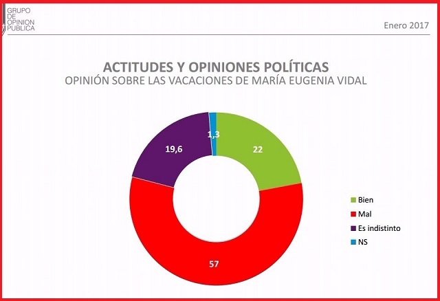 Las vacaciones de Vidal en México marcaron la baja. El 57 por ciento de los encuestados por la consultora consideró de manera negativa el viaje mientras que solo el 22 por ciento las aprobó. En tanto, un 43,8 por ciento opinó que fue incorrecto que viajara al exterior y un 35, por ciento aseguró que era “indistinto”. Es decir, un porcentaje de la población valoró de manera negativa su ausencia, independientemente del lugar elegido.