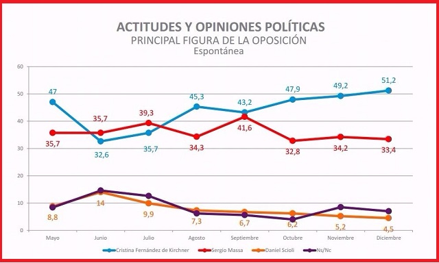 En paralelo a la (leve) caída de Vidal en la provincia, la encuesta marca la consolidación de Cristina Fernández de Kirchner como principal figura de la oposición, mencionada como tal por el 51,2 por ciento de los encuestados. A casi 20 puntos de distancia se ubica Massa, mencionado por el 33,4 por ciento de los encuestados. En tanto, un 43,5 por ciento de los ciudadanos que participaron del sondeo aseguró que es Cristina quien debe liderar un frente opositor al Gobierno de Macri.