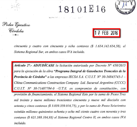 A través de una UTE, IECSA y CCCC obtuvieron de manos de Mauricio Macri la millonaria licitación del segundo tramo del gasoducto de Córdoba por la suma de $3,039,359,016.75.