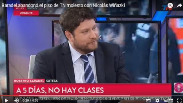 Horas después de haber sido blanco del desafortunado comentario del presidente Mauricio Macri durante la apertura de sesiones ordinarias en el Congreso, el dirigente de Suteba Roberto Baradel volvió a quedar en medio de una polémica. Fue durante una entrevista televisiva en el canal TN. Ante una pregunta del periodista Nicolás Wiñazki, el docente se enfureció y abandonó el estudio. ¿Qué lo indignó tanto?